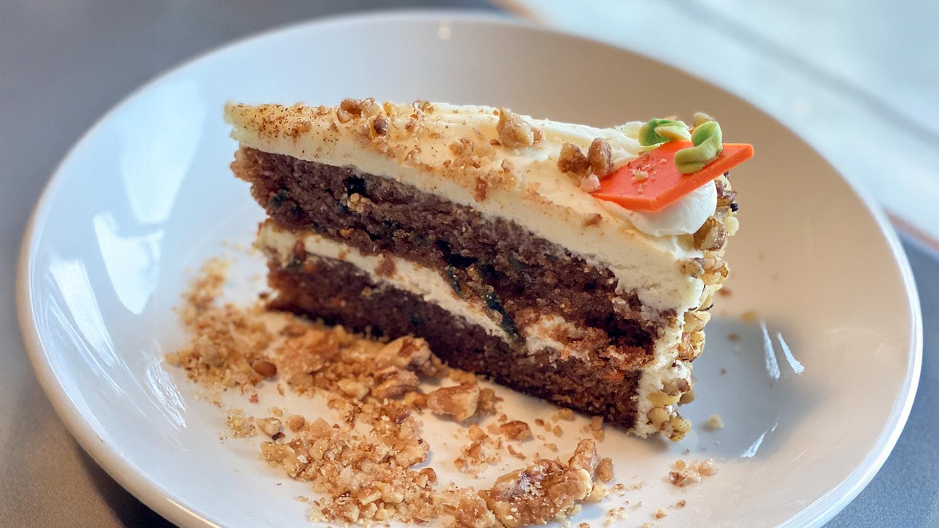 cake itself is made with fresh carrots. Filled and frosted with a perfect cream cheese frosting and generously coated with fresh walnuts.