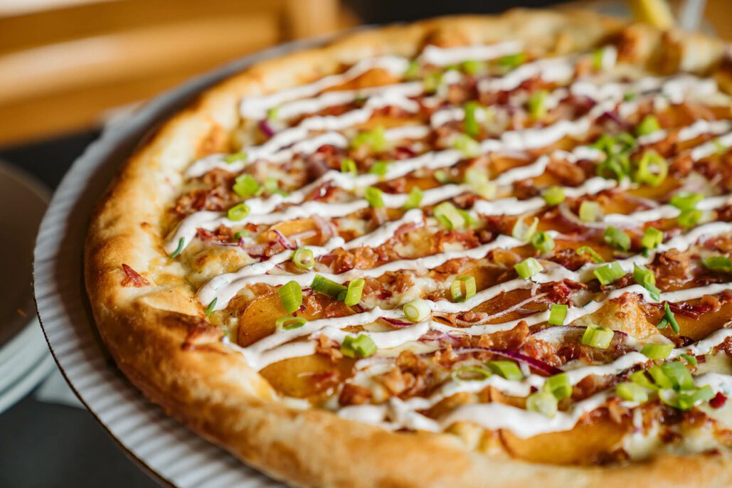 Olive Oil, Minced Garlic, Mozzarella, White Cheddar, Seasoned Yukon Gold Potatoes, Red Onion, Bacon, and Lemon-Chive Sour Cream and Green Onions after the bake